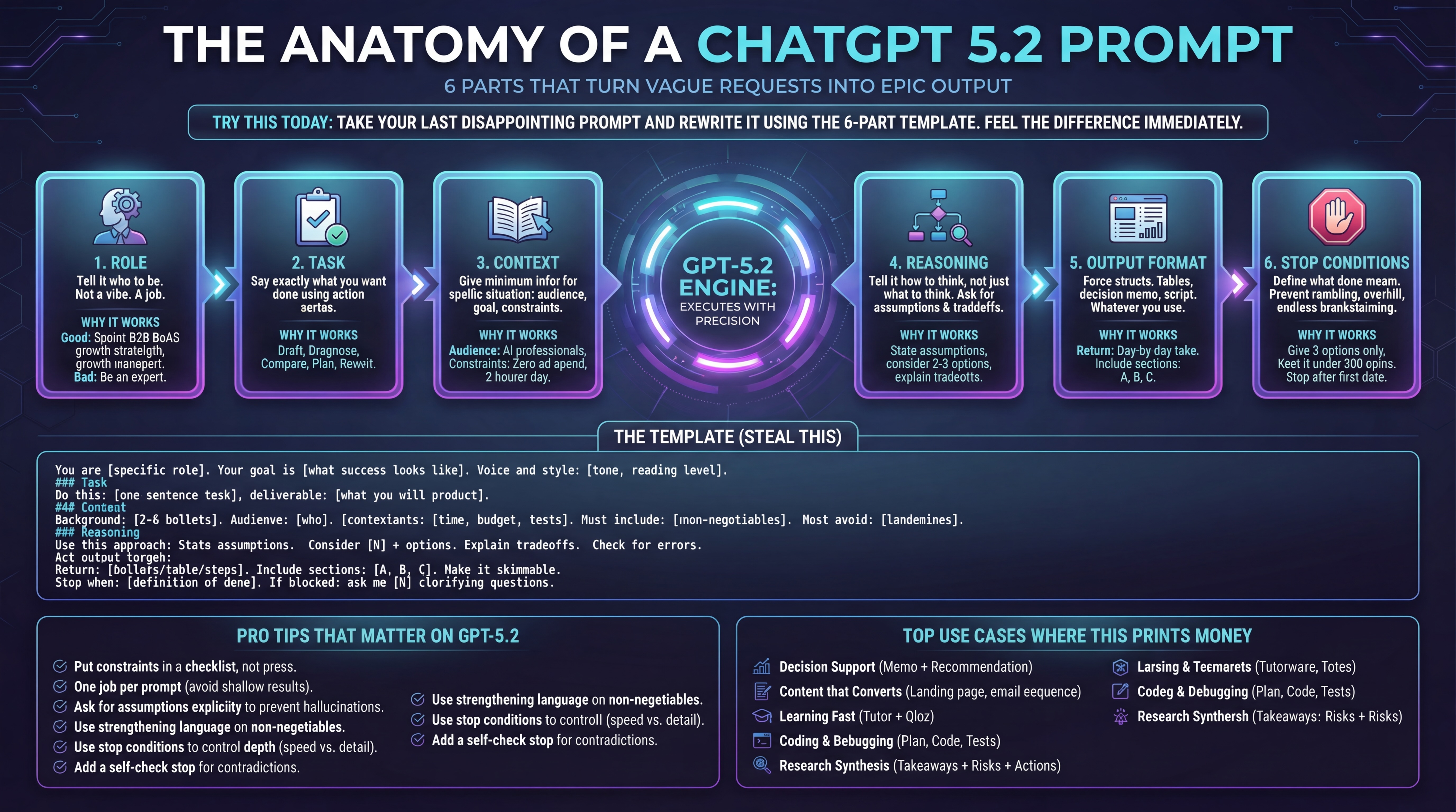 Most prompts fail because they are missing one of these: Role, Task, Context, Reasoning, Output format, Stop conditions. Add all six (with clear section headers) and ChatGPT 5.2 stops guessing and starts executing.