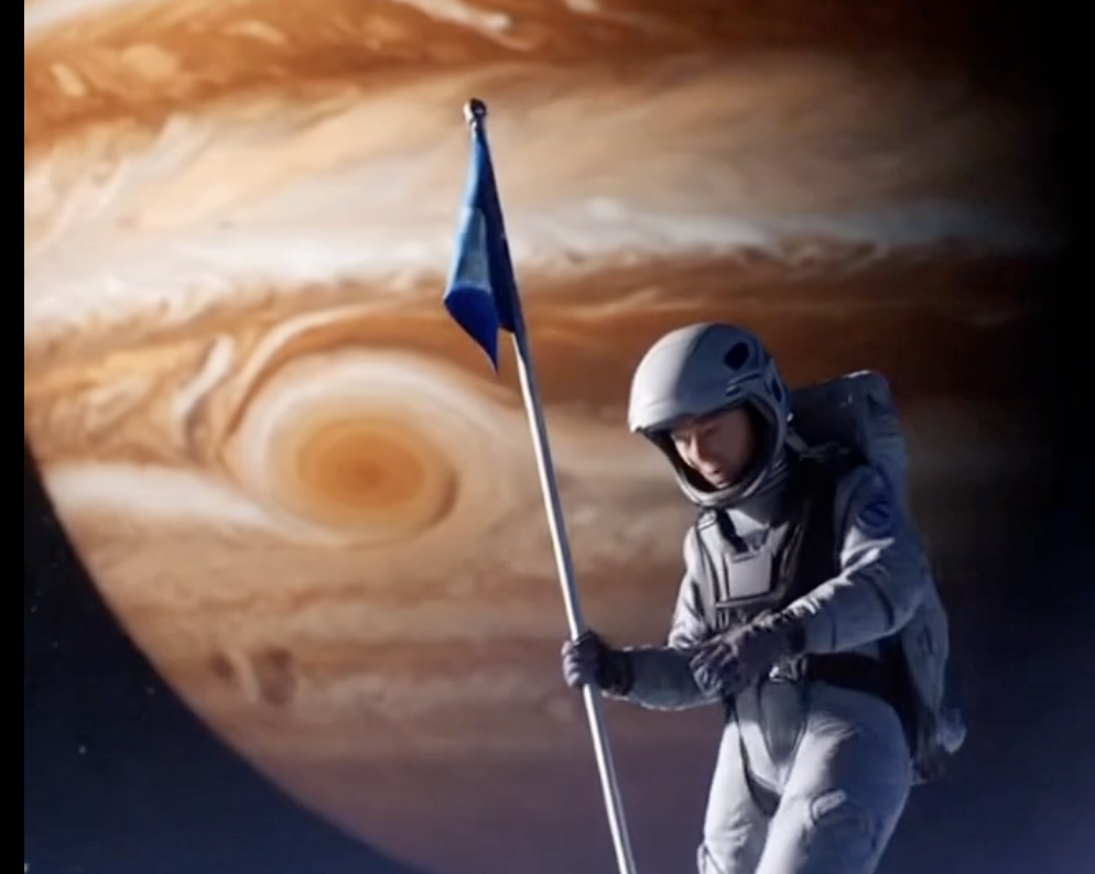 A space exploration epic showing humanity's first landing on Europa, Jupiter's ice moon. A sleek spacecraft descends through geysers of water vapor erupting from Europa's fractured ice surface. Jupiter dominates half the sky, its Great Red Spot clearly visible, casting rusty orange light across the frozen landscape. The landing site is a vast plain of pressure ridges and ice canyons, glowing blue-white in the alien sunlight filtered through Jupiter's atmosphere. Inside the cockpit, three astronauts. Through the window, they can see Earth, a tiny pale blue dot visible beyond Jupiter's limb. The spacecraft's landing lights illuminate ice crystals floating in the thin atmosphere like diamonds. Sweeping orchestral shots alternating between spacecraft exterior and intimate cockpit interior High angles showing spacecraft against Jupiter's majesty, close-ups of astronauts' faces reflecting wonder. The spacecraft rotates slowly, revealing Jupiter filling the entire viewport, astronauts gasping in unison. Landing thrusters fire, creating swirling patterns in the ice crystals below. Inside: three gloved hands join together in the center of the cockpit, squeezing tightly. Touchdown: landing legs compress into the ice, plumes of vapor erupting around the craft. The lead astronaut reaches forward and plants a flag showing Earth against stars, not any single nation. Dialogue (mission commander, voice thick with emotion): "Europa base to Earth. The future... has arrived."