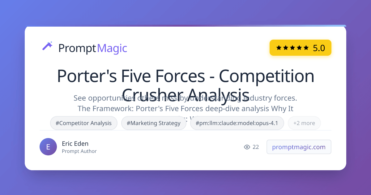See opportunities others miss by understanding industry forces. The Framework: Porter's Five Forces deep-dive analysis Why It Works: While everyone obsesses over competitors, smart businesses analyze the entire competitive landscape.