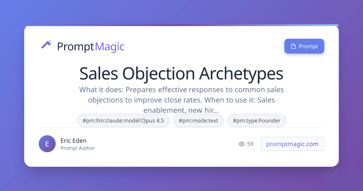What it does: Prepares effective responses to common sales objections to improve close rates. When to use it: Sales enablement, new hire onboarding, or when win rates are declining.