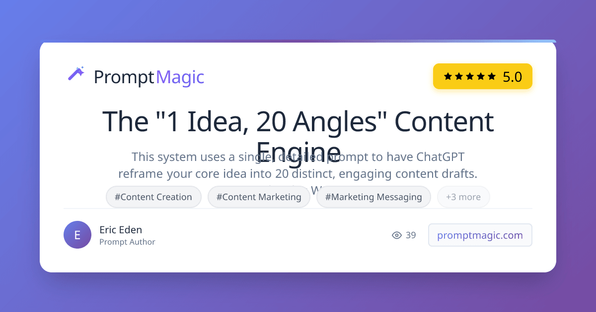 This system uses a single, detailed prompt to have ChatGPT reframe your core idea into 20 distinct, engaging content drafts. Why This Works (The Psychology): The Rule of 7: Marketing research shows people need to see a message 7+ times before taking action The Forgetting Curve: Your audience forgets 90% of what they read within 7 days Pattern Recognition: Our brains are wired to trust consistent messages from consistent sources