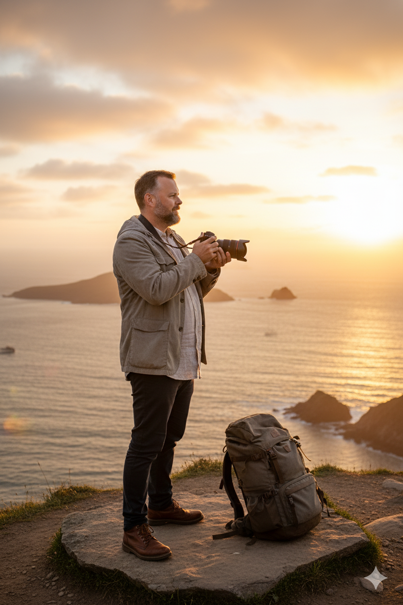 Turn the subject into a travel blogger capturing a moment on a scenic adventure. The location is a cliffside viewpoint at sunset over the ocean, or a bustling, colorful marketplace in Marrakech. The subject is wearing practical but stylish travel gear, holding a camera, with a backpack nearby. The pose is candid and natural, looking out at the view. The lighting is warm, natural, and enhances the wanderlust aesthetic.