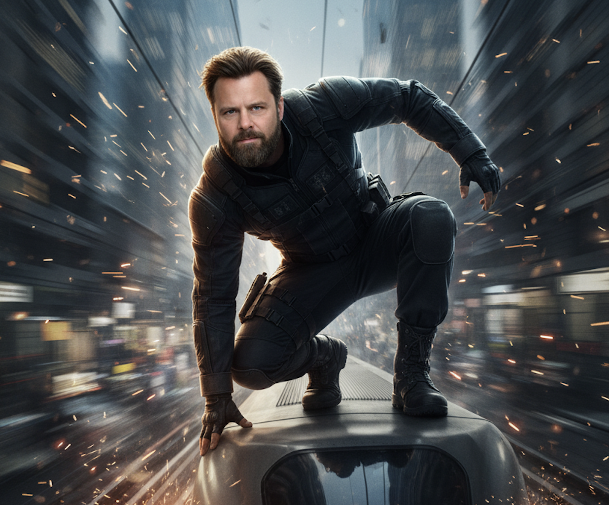 An ultra-realistic, use uploaded photo 100,999% facial reference, cinematic motion shot of a male hero balancing on top of a speeding bullet train. The city blurs by below as sparks fly from the tracks. He crouches low in tactical gear, gripping the edge of the train roof with one hand, ready for combat. Dramatic lighting, wind and motion realism, intense perspective, ultra-detailed 8K, 9:16 ratio, Mission-Impossible-style tone.