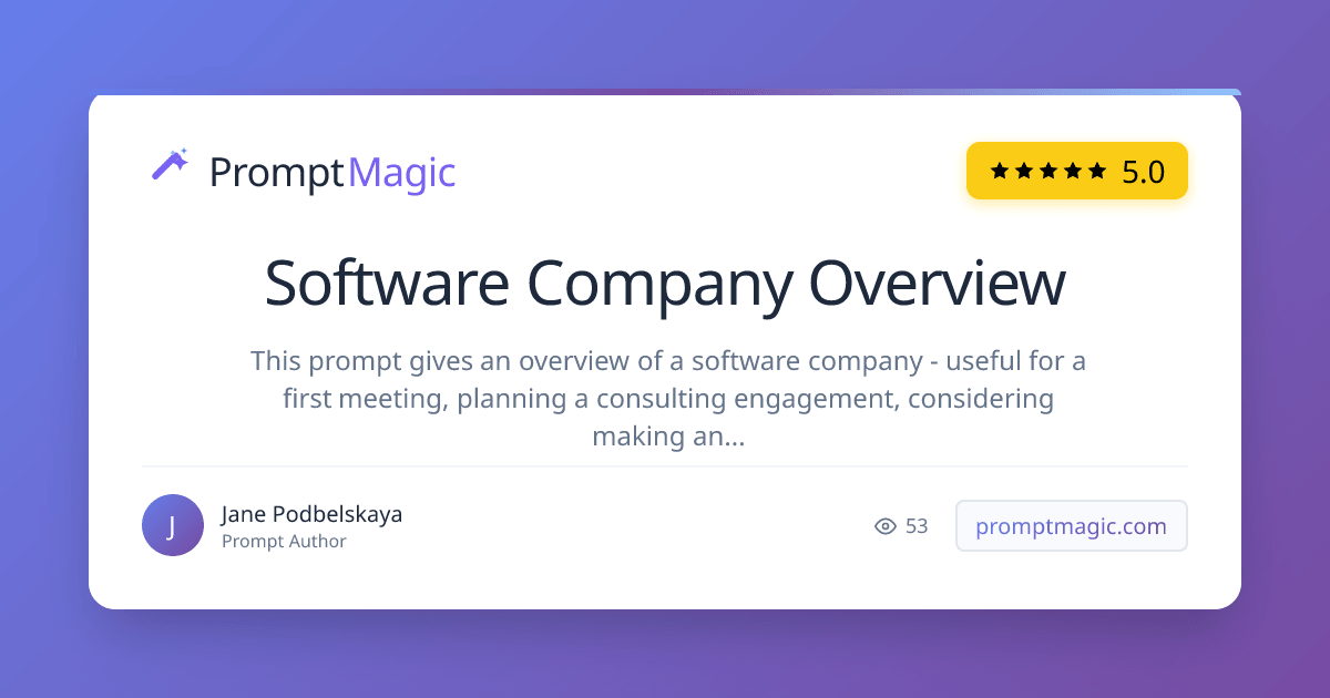 This prompt gives an overview of a software company - useful for a first meeting, planning a consulting engagement, considering making an investment, or assessing a competitor.